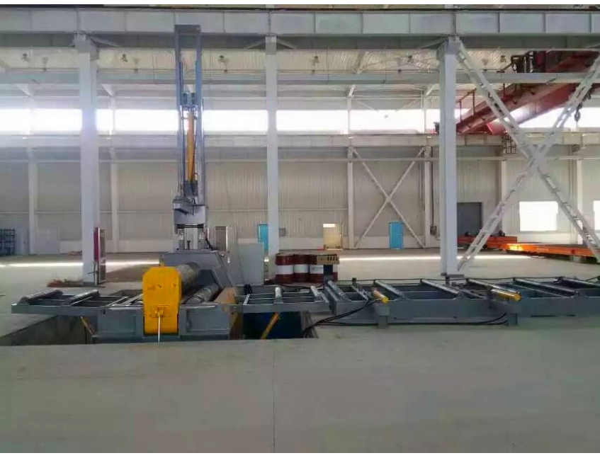 翻倒裝置由滑枕、翻倒油缸等組成。裝于翻倒機(jī)架一側(cè),用于翻倒機(jī)架的翻轉(zhuǎn)及恢復(fù)。翻倒裝置的翻倒,便于制品沿輥?zhàn)拥妮S向方向取出。