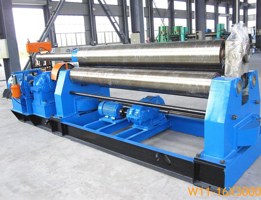 W11-16x3000機械對稱式三輥卷板機是全機械式三彎板機。 三個滾筒全部固定,像金字塔一樣放置。